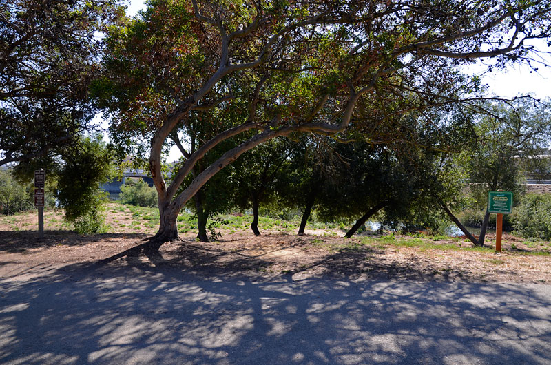 In addition to the "Area Temporarily Closed" signs, the sandy area in between the San Lorenzo Park Benchlands and the Water Street Bridge is marked with one lone "Area Closed For Vegetation Restoration" sign. Entering that area without a permit is also a violation of municipal code SCMC 13.04.010.