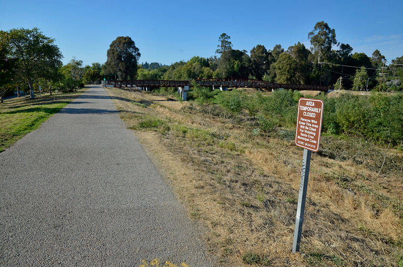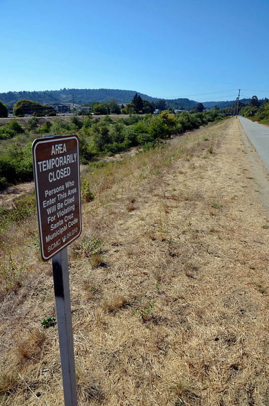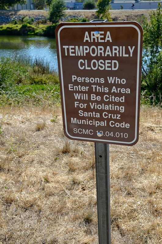 Almost an entire mile of the river levee has been closed to all uses by the public. The signs read, "AREA TEMPORARILY CLOSED. Persons Who Enter This Area Will Be Cited For Violating Santa Cruz Municipal Code 13.04.010, and they have also been installed in the area behind the businesses on two blocks of Front Street that border the river. The installation of the new signs by the Parks department comes after weeks of raids on the homeless by the Santa Cruz Police Department.
