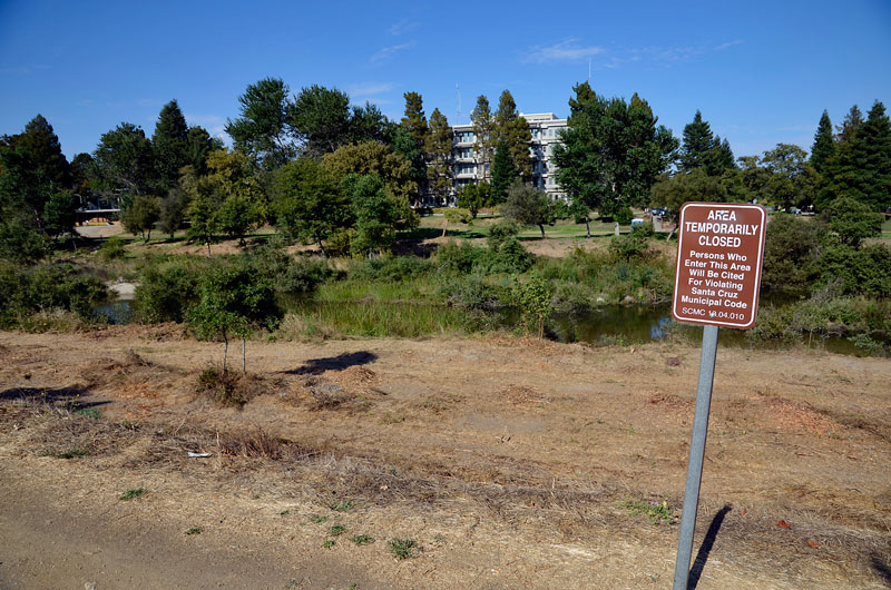 According to signs installed by the City of Santa Cruz Parks and Recreation department, the levee area of the entire downtown segment of the San Lorenzo River, stretching from the Laurel Street Bridge to the Highway One Bridge, is 'temporarily closed' and persons who enter the area will be cited under local municipal code 13.04.010. The new signs line approximately three quarters of the San Lorenzo Riverway trail and are spaced at a distance of about 75-100 feet apart. They were installed less than a week ago on both banks of the river, according to First Alarm security guards who patrol the area and were interviewed on August 11 and 12. This was confirmed by an older, disabled homeless woman who was sitting next to one of the signs in San Lorenzo Park. "It's horrible what they are doing to us," she said. Her friend, also an older woman, pointed in the direction of another one of the signs that was located near the river by the Water Street Bridge, "That is my home," she said.