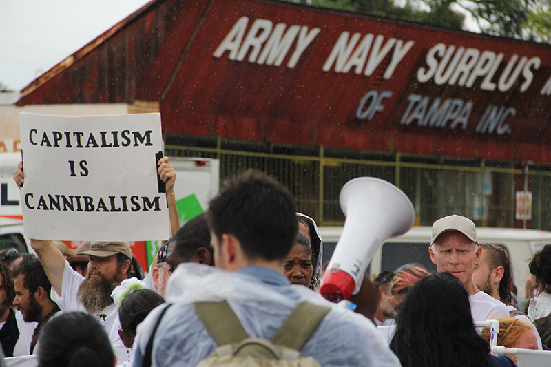 Prior to this year's Republican National Convention in Tampa, the Poor People’s Economic Human Rights Campaign managed to establish an encampment inside the security "Event Zone" by leasing the unused land that wraps around an Army-Navy surplus store. On August 27th, the PPEHC called for a March For Our Lives to leave Romneyville and head through downtown Tampa in order to highlight economic injustices in America today. Law enforcement authorities, however, decided not to allow the unpermitted march to proceed, stopping the demonstration with a massive show of force less than a half hour into the march down North Tampa Street. There had been no illegal actions witnessed by this reporter on the part any protesters other than the act of marching without a permit. As the number of marchers slowly dwindled to dozens over the next half hour by moving away through Lykes Gaslight Park, the number of police surrounding the remaining marchers continued to grow into the mid-hundreds until finally a torrential downpour sent most of the soaked police and deputies away to their various staging areas.