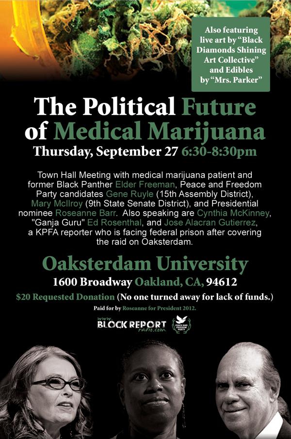 Roseanne Barr, "the only serious comedian running for president," will be speaking in Oakland. Barr is running for President, with Cindy Sheehan as her running mate.