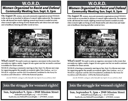 W.O.R.D. is hosting a community meeting on Sun. Sept. 9 to discuss next steps for organizing against the assaults on women’s rights. Peta Lindsay--an L.A. W.O.R.D. organizer and the 2012 Presidential candidate for the Party for Socialism and Liberation--will be the featured speaker.