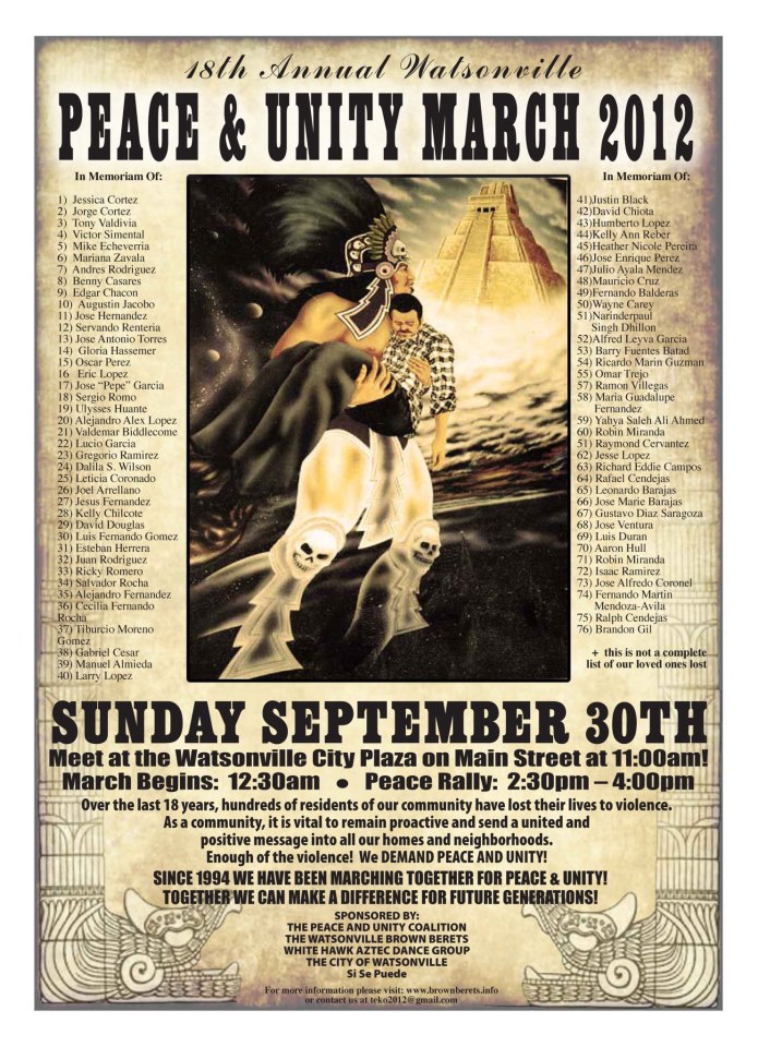 THE PEACE AND UNITY COALITION, THE WATSONVILLE BROWN BERETS, WHITE HAWK AZTEC DANCE GROUP, THE CITY OF WATSONVILLE, PAJARO VALLEY FEDERATION OF TEACHERS, LUIS ALEJO, ALI ESPINOSA, FELIPE HERNANDEZ, JOVITA MOLINA, THE RESOURCE CENTER FOR NONVIOLENCE, BARRIOS UNIDOS, ROCIO BURGUS, THE REDWOOD PEACE FUND, MARIA LUISA ALEJO, RAMIRO MEDRANO, HARTNELL COLLEGE, KARINA CERVANTEZ, THE HOMIES EMPOWERMENT PROGRAM, DEFENSA DE LAS MUJERES, AND THE OW FAMILY.