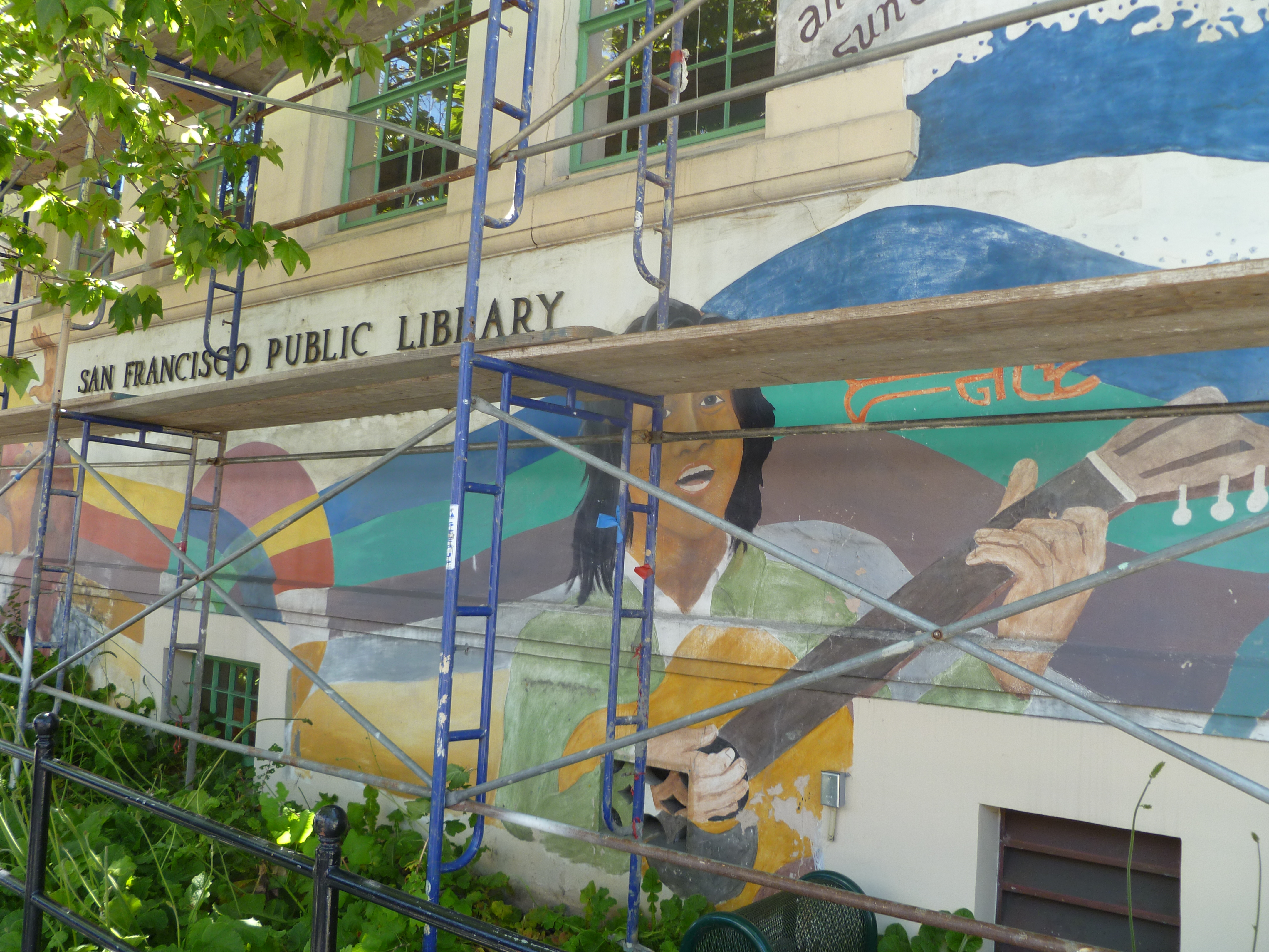 San Francisco, June 14, 2012 – Library Users Association’s efforts to stop the paintout of the Arch Williams mural on Bernal Heights Branch Library have succeeded in temporarily halting the destruction that the library had scheduled to begin on Monday, June 11. Scaffolding was erected June 8 and remains standing.