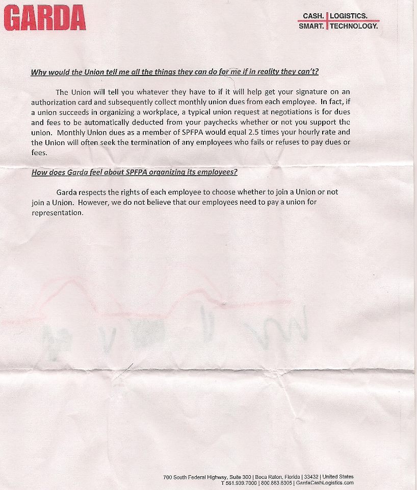 On September 10, 2012 the International Union, Security, Police and Fire Professionals of America (SPFPA) the largest, oldest and fastest growing 9(b)3 Security Union in the world today has announced a National campaign to organize the 7,500 Garda security drivers, messengers and ATM Technicians working at 165 Garda Cash Logistics locations throughout North America.