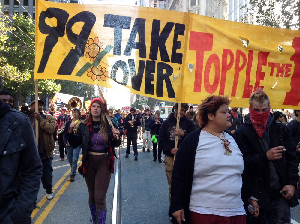 Activists gathered mid-day at Justin Herman Plaza -- former site of the Occupy SF camp -- and marched down Market Street and through the financial district. Meanwhile, a group organized by Community Not Commodity/OccuPride and others rallied and marched in the Castro, known as the city's gay neighborhood.
