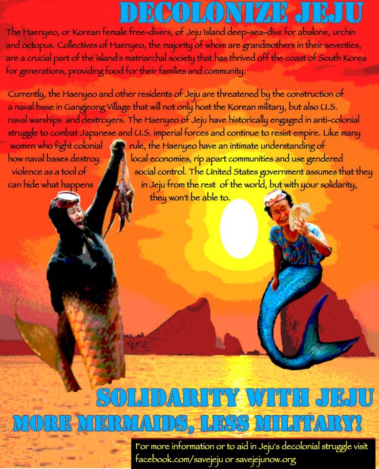 Jeju is home to the world renown elder female free divers, who dive up to 60 feet without special equipment to fish for urchin and octopus in order to provide food for their families. The divers, many of whom are grandmothers, have been protesting the Naval Base daily and see it as a move of South Korea and the United States to secure colonial control of the land.