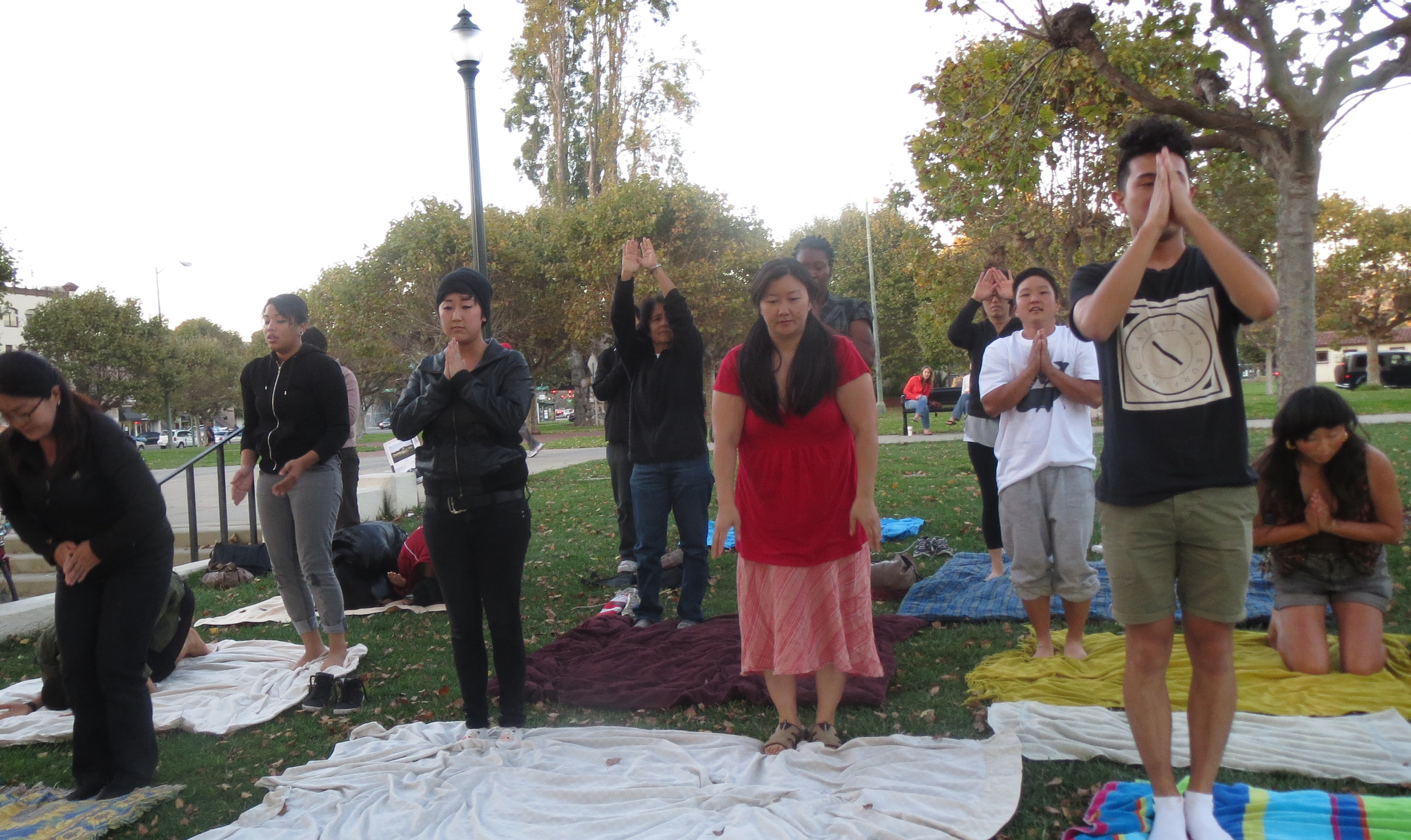 At sunset, activists gathered on a grassy area near Lake Merritt and began a bowing ceremony, a Korean Buddhist tradition, to show resistance to militarism and solidarity with Jeju but also to connect anti-colonialist struggles in South Korea with ones closer to home. Oakland resident Sarah Chee led the group in a series of 108 bows. “Each bow symbolizes the breaking of delusions in our daily lives,” Chee explained, “In the context of activism, we are reflecting on the ways that fear and violence manifest in these delusions.”