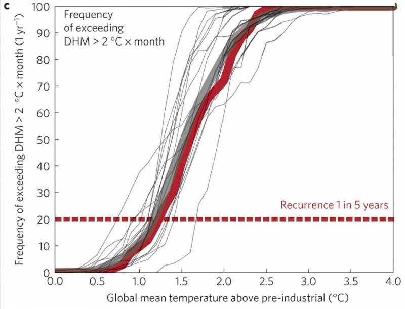 Despite the inclusion of optimistic scenarios concerning rates of evolutionary adaptation, our results confirm that coral reef ecosystems face considerable challenges under even an ambitious mitigation scenario that constrains global warming to 1.5 °C above pre-industrial temperatures. Our projections suggest that most coral reefs will experience extensive degradation over the next few decades given the present behaviour of corals to thermal stress.To protect at least 50% of the coral reef cells, global mean temperature change would have to be limited to 1.2 °C (1.1-1.4 °C), especially given the lack of evidence that corals can evolve significantly on decadal timescales and under continually escalating thermal stress. There is little doubt from our analysis that coral reefs will no longer be prominent within coastal ecosystems if global average temperatures exceed 2 °C above the pre-industrial period.