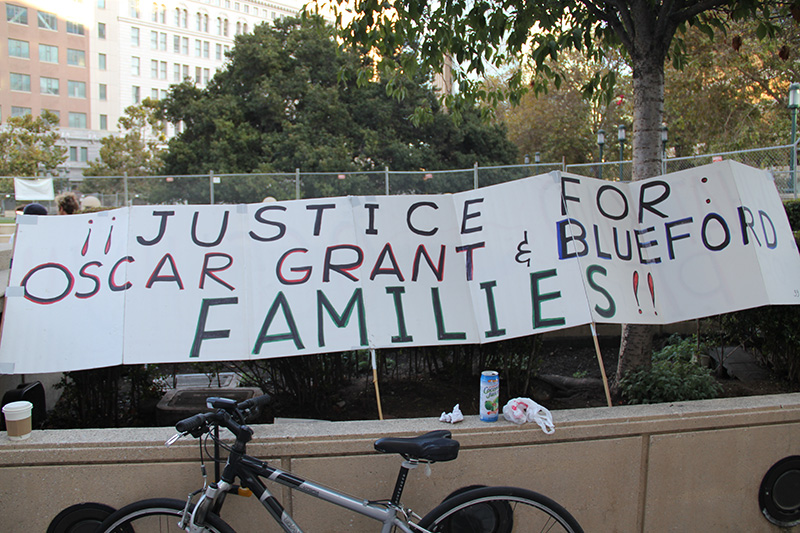 [Pictured above: Sign outside city hall reads, "Justice for Oscar Grant & Blueford families!!" Grassy area of plaza in background is fenced off.]