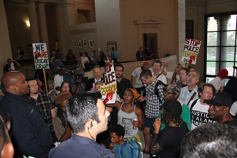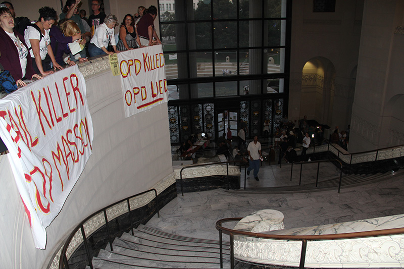 Knowing that those demanding justice for Alan Blueford intended to return to city hall on October 2nd to continue to press demands, the city brought out dozens of Oakland police, closed to the public the viewing galleries above council chambers, and restricted who was allowed to attend the meeting in the main hall, leaving many seats empty.