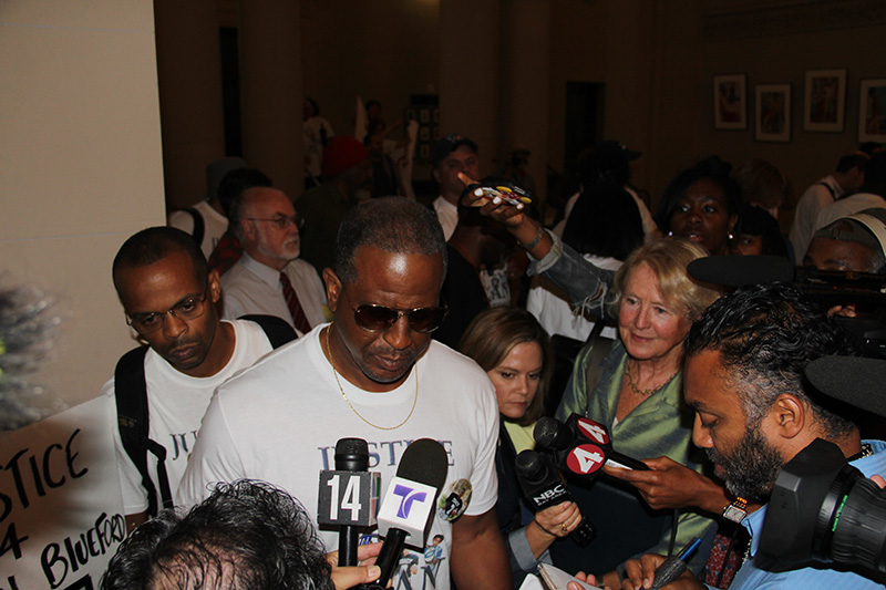 Nevertheless, enough demonstrators, including Alan Blueford's family, made it into the main chamber before OPD locked down the room at the start of the meeting that normal council business was not allowed to proceed. Eventually, an exasperated councilmember Larry Reid handed over his personal copy of the police reports to the Blueford family, reports that Oakland police chief Howard Jordan posted online for public consumption at about the same time. The Blueford family thanked supporters for demonstrating for justice for their son. Family and supporters then left city hall for the night to review the the non-redacted information in the reports.