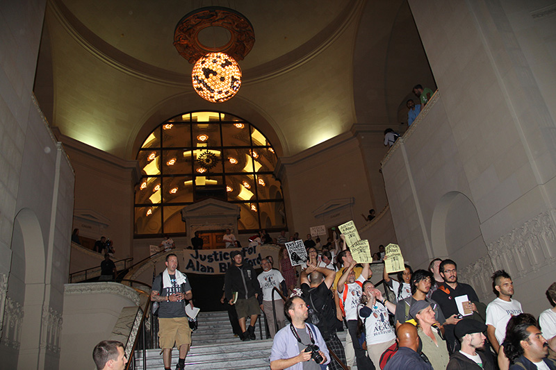 On September 18th, the family of Alan Blueford and supporters disrupted the Oakland city council meeting, demanding answers and accountability for the murder of Alan Blueford by officer Miguel Masso on May 6th. The meeting was shut down by council members before its scheduled conclusion when members just walked out of the chamber. City leaders followed up the next day by announcing that new policies would be devised to regulate public attendance of city council meetings.