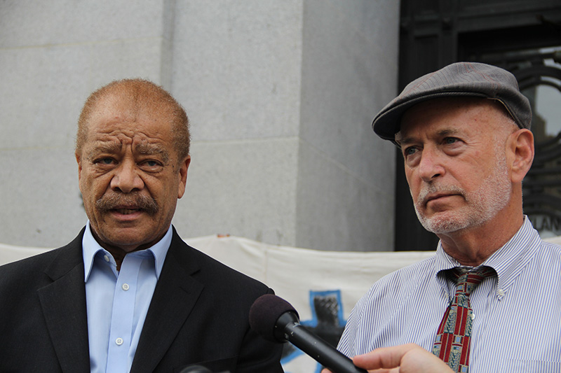 [Pictured above: Walter Riley and Dan Siegel speak to assembled media and Alan Blueford supporters.]