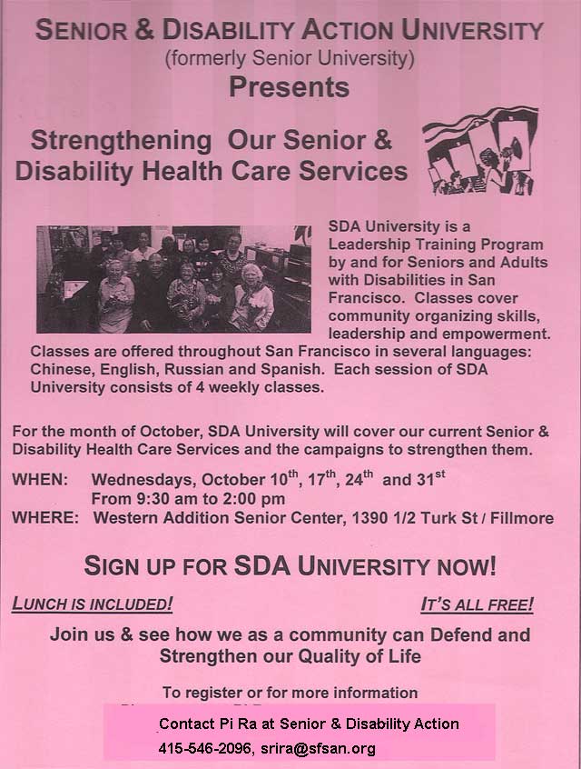 SDA (Senior & Disability Action) University was formerly Senior University, and is presented by Senior & Disability Action, a merger of Senior Action Network and Planning for Elders in the Central City.