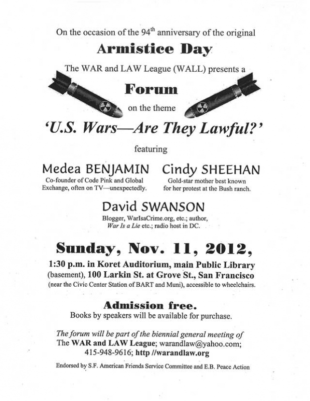 As the 94th anniversary of WWI’s Armistice Day approaches, US undeclared wars encroach further on legality, now encompassing targeted assassinations and indefinite detentions without charge. War and League presents a forum, “US Wars – Are they Lawful?” Admission Free. Endorsed by SF American Friends Service Committee, East Bay Peace Action, and SF Gray Panthers.