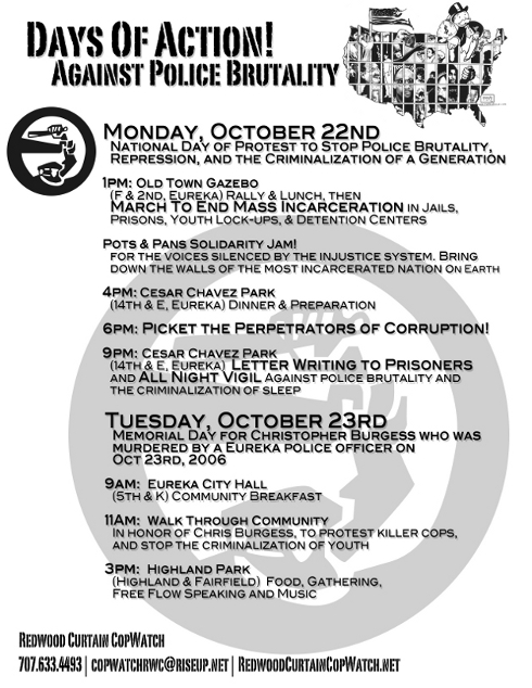 Behind the Redwood Curtain, we recognize and continue actions through October 23rd: We remember Christopher Burgess, who was 16 years old when Eureka Police Department officer Terry Liles chased, shot and killed him on October 23, 2006.