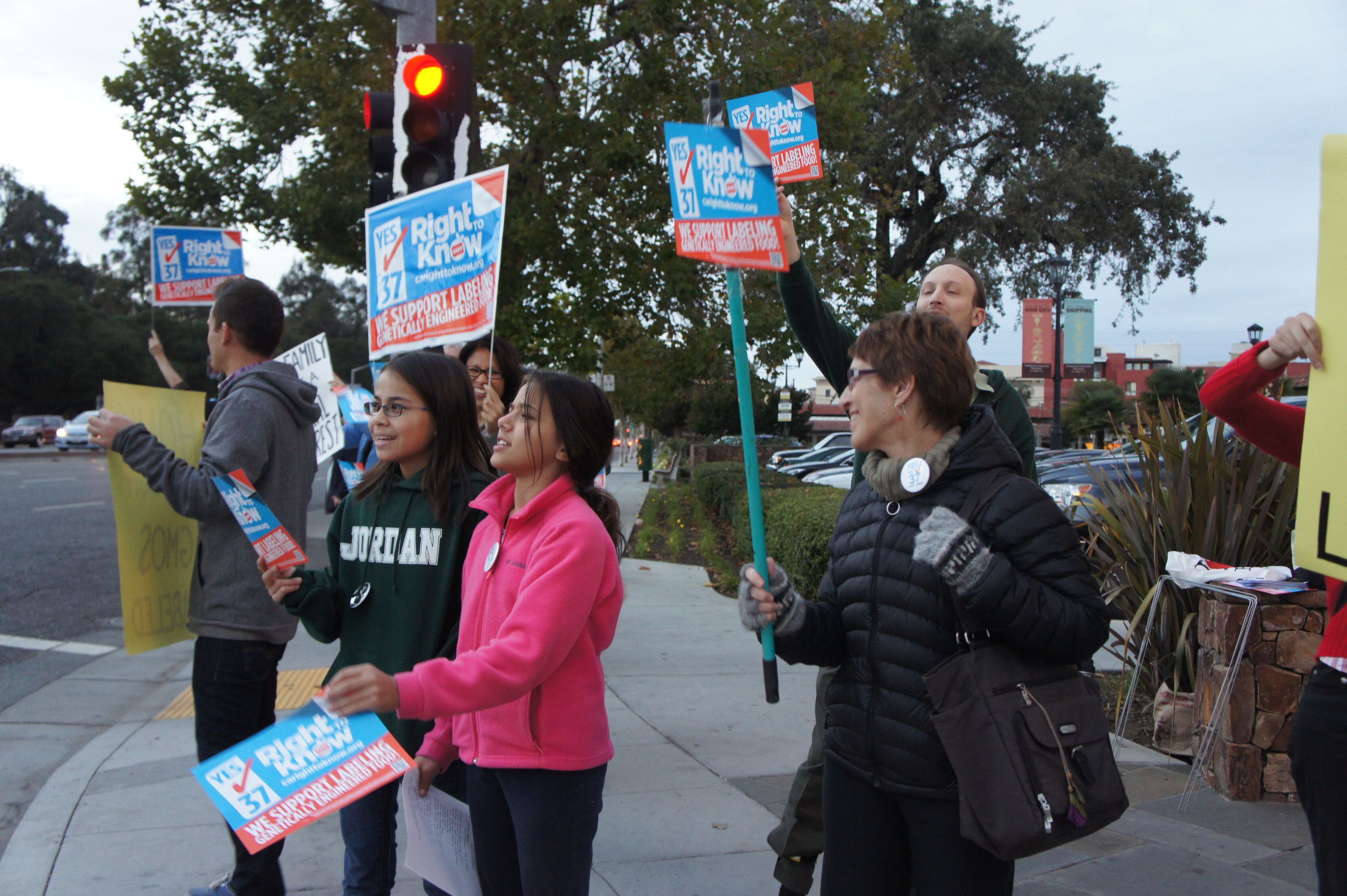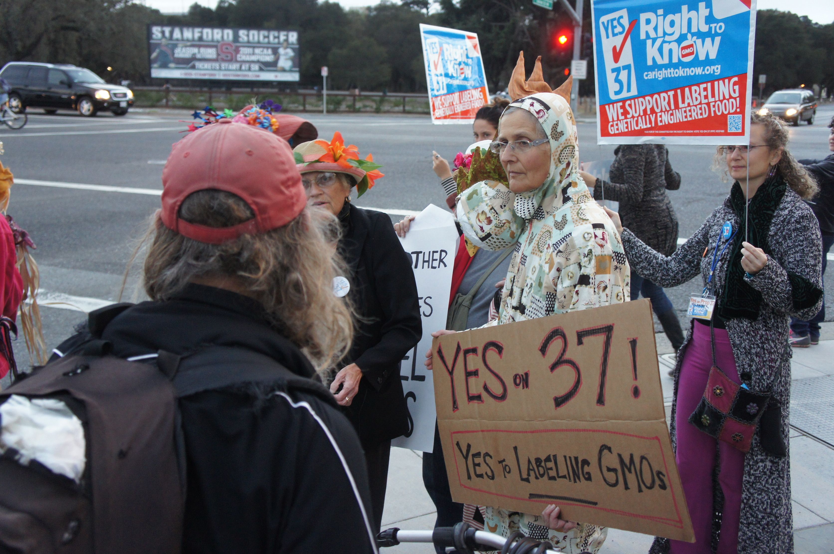 Dozens rallied at the corner of Embarcadero and El Camino Real last night. With signs and songs they declared, "We have a right to know what's in our food!" They encouraged passersby to vote YES on Proposition 37 that would require labeling of food that is not GMO free.