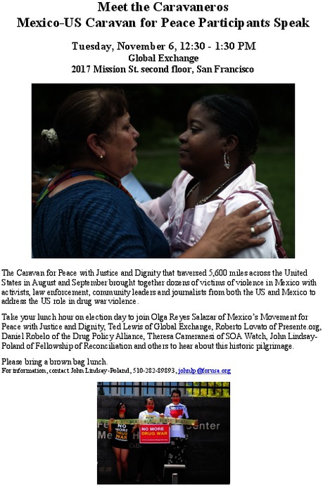 Take your lunch hour on election day to join Olga Reyes Salazar of Mexico’s Movement for Peace with Justice and Dignity, Ted Lewis of Global Exchange, Roberto Lovato of Presente.org, Daniel Robelo of the Drug Policy Alliance, Theresa Cameranesi of SOA Watch, John Lindsay-Poland of Fellowship of Reconciliation and others to hear about this historic pilgrimage.