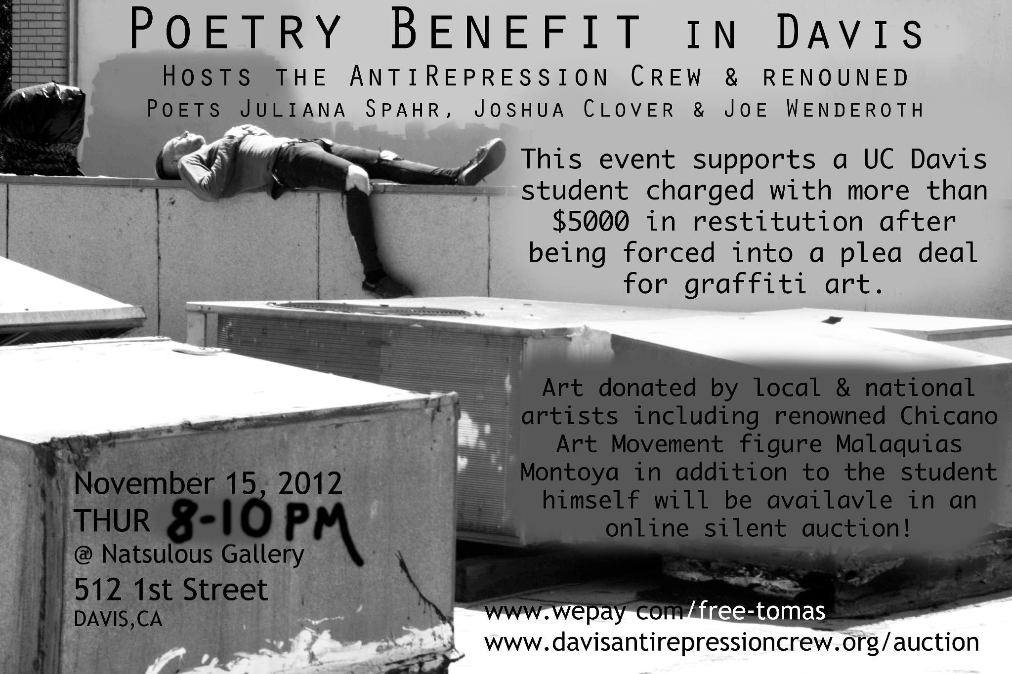 Internationally acclaimed poets will be reading and artists will be selling their work to raise money for Tomas Matzat, a UC Davis student who was pepper-sprayed by University Police last year and is now facing $5000 in court fees.