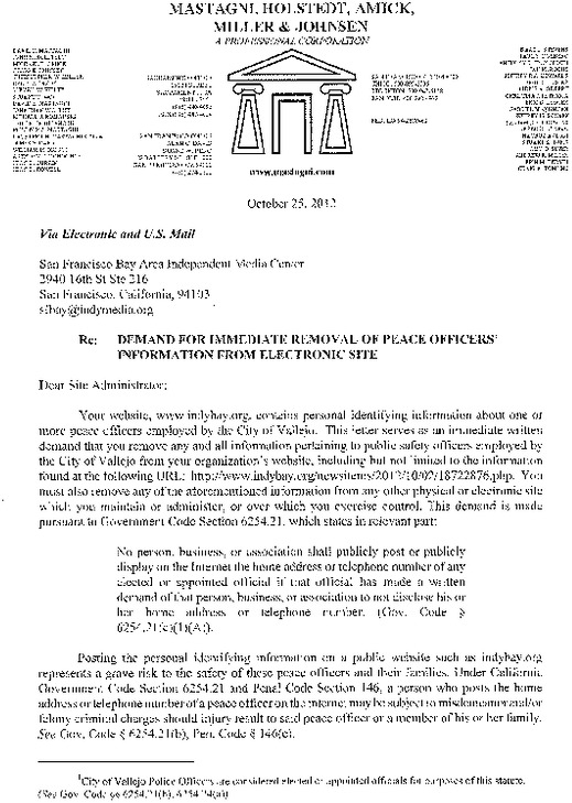 As is common in letters from lawyers demanding the removal of content, citations of law are used erroneously in an attempt to intimidate the Indybay Collective into removing the objectionable material. In the case of the recent Vallejo Copwatch post, attorney David E. Mastagni refers to California Government Code Section 6254.21: