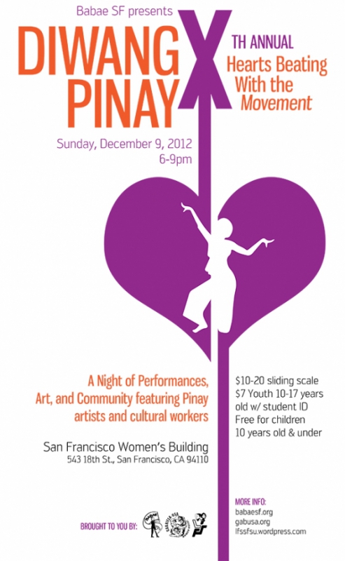 Diwang Pinay is back with ferocity in 2012 as we celebrate its tenth year anniversary! The longest running event for Pinays, by Pinays - join Babae-San Francisco and The League of Filipino Students (LFS) as we present Kilos Kababaihan: Hearts Beating with the Movement on Sunday, December 9, 2012 from 6 to 9 p.m. at theWomen’s Building in San Francisco. This year, Diwang Pinay is honored to present a theater piece from the caregivers and workers of the Filipino Community Center and Gabriela-USA’s CARE Project, who will proudly launch Migrante-USA, a chapter of the international workers organization Migrante International.