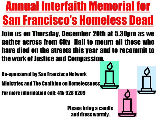 Please join us and San Francisco Network Ministries and Coalition on Homelessness on December 20, 5:30 p.m., in Civic Center Plaza for an interfaith memorial for our family members, friends, and community members who have passed away while homeless in 2012.