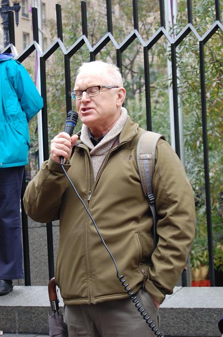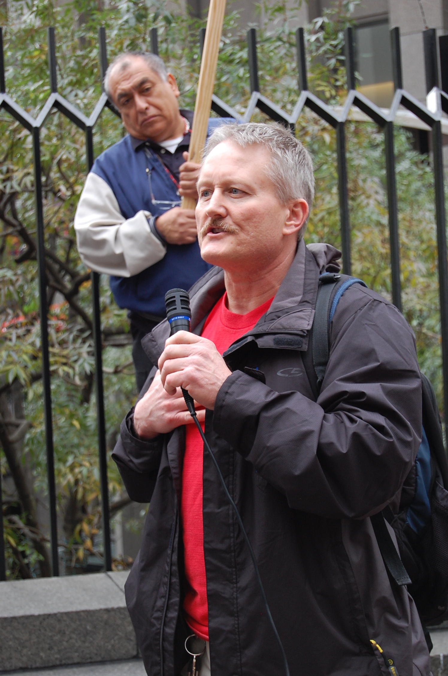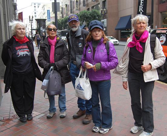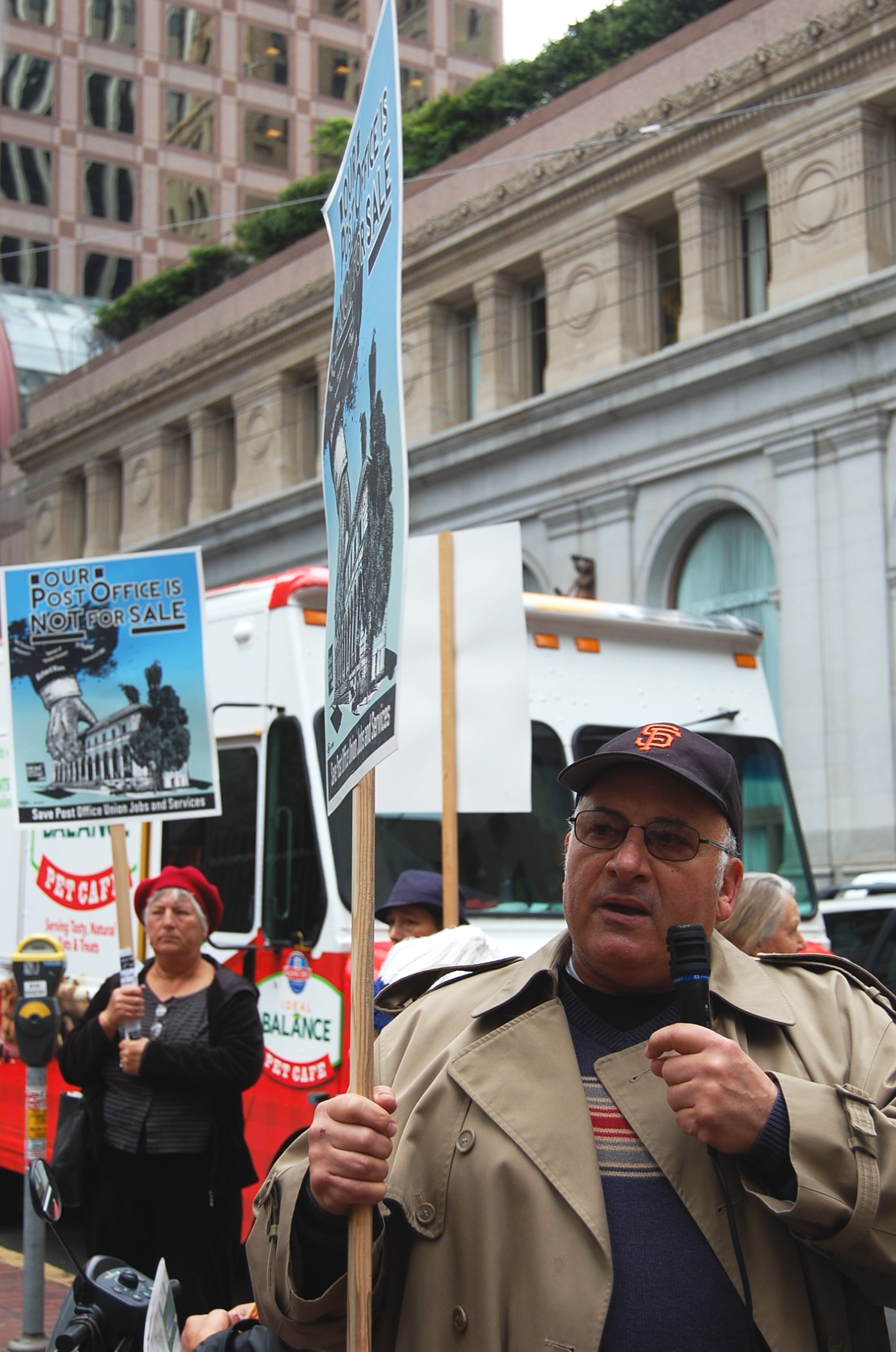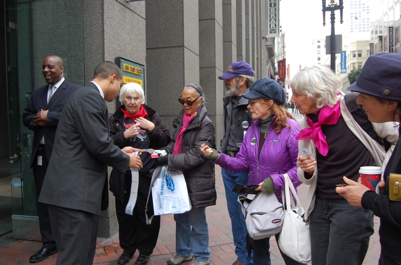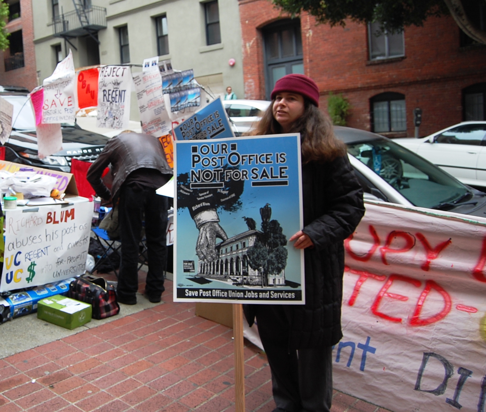 Tuesday, December 4th The Save Our Post Office Coalition of SF, Save the Berkeley Post Office Committee, Berkeley-East Bay Gray Panthers, SF Gray Panthers, The Living New Deal, Grandmothers Against War, joined retired and current postal workers to tell Richard Blum, CBRE, Inc.” Stop selling our post offices.” Occupy SF & Occupy Oakland camped out over night in front of his SF financial district office, 909 Montgomery, with tables of information on CBRE and Blum. We then marched through the financial district to Senator Feinstein’s office. After a rally outside, a delegation led by Margot Smith of Berkeley-East Bay G, met with Senator Feinstein calling on her to do the right thing and save our post offices. Feinstein happens to be the spouse of Richard Blum. As Richard Koritz of North Carolina State Assoc. of Letter Carriers said at the rally- what an example of a marriage between political and corporate corruption.