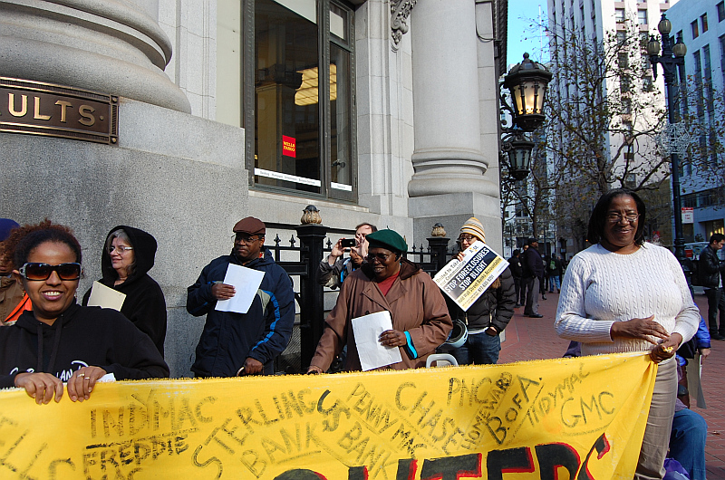 Tony Robles, a member of Senior and Disability Action and a 4th generation San Franciscan, started the rally citing case after case of folks who are in foreclosure, forced out of homes they have lived in for decades. Like Larry Fox being thrown out of his home he has lived since as a child when his father took him watch as it was being built.And Robert Moses, 92. year old WWII Veteran, refinanced his nearly paid-off loan with Deutsche Bank to bring his home up to city code. Deutsche raised his interest rate and payment to $3,400 a month. Many seniors living on Social Security and/or fortunate enough to have a pension usually average far less that that amount a month to live on