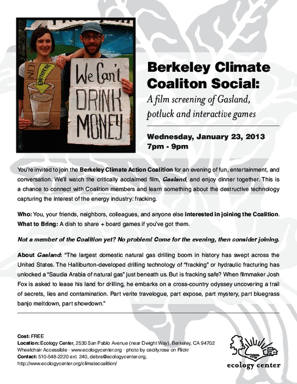 Please join the Berkeley Climate Action Coalition for an evening of fun, entertainment, and conversation. We'll watch the critically acclaimed film, Gasland, and enjoy dinner together. This is a chance to connect with Coalition members and learn something about the destructive technology capturing the interest of the energy industry: fracking.