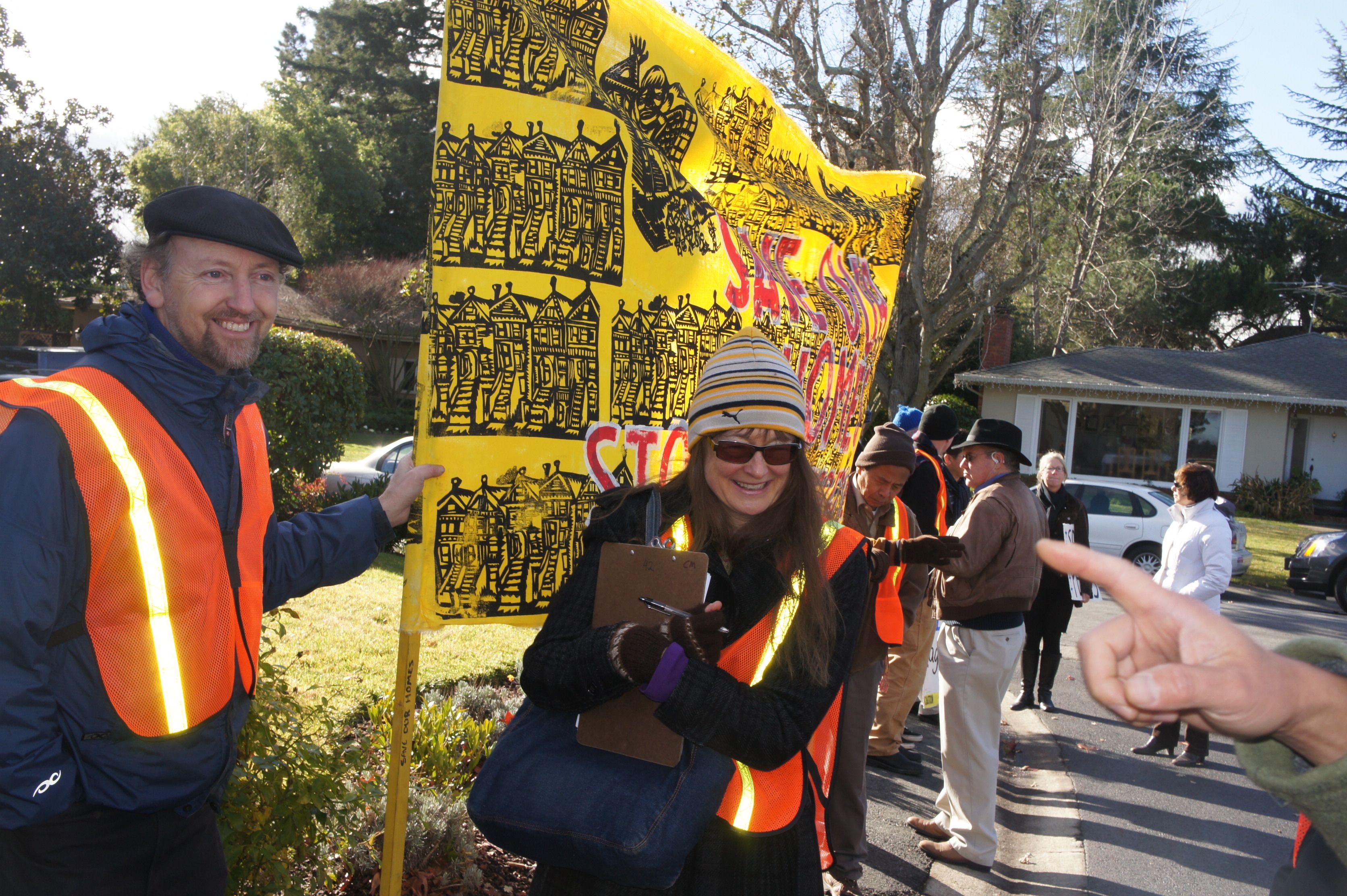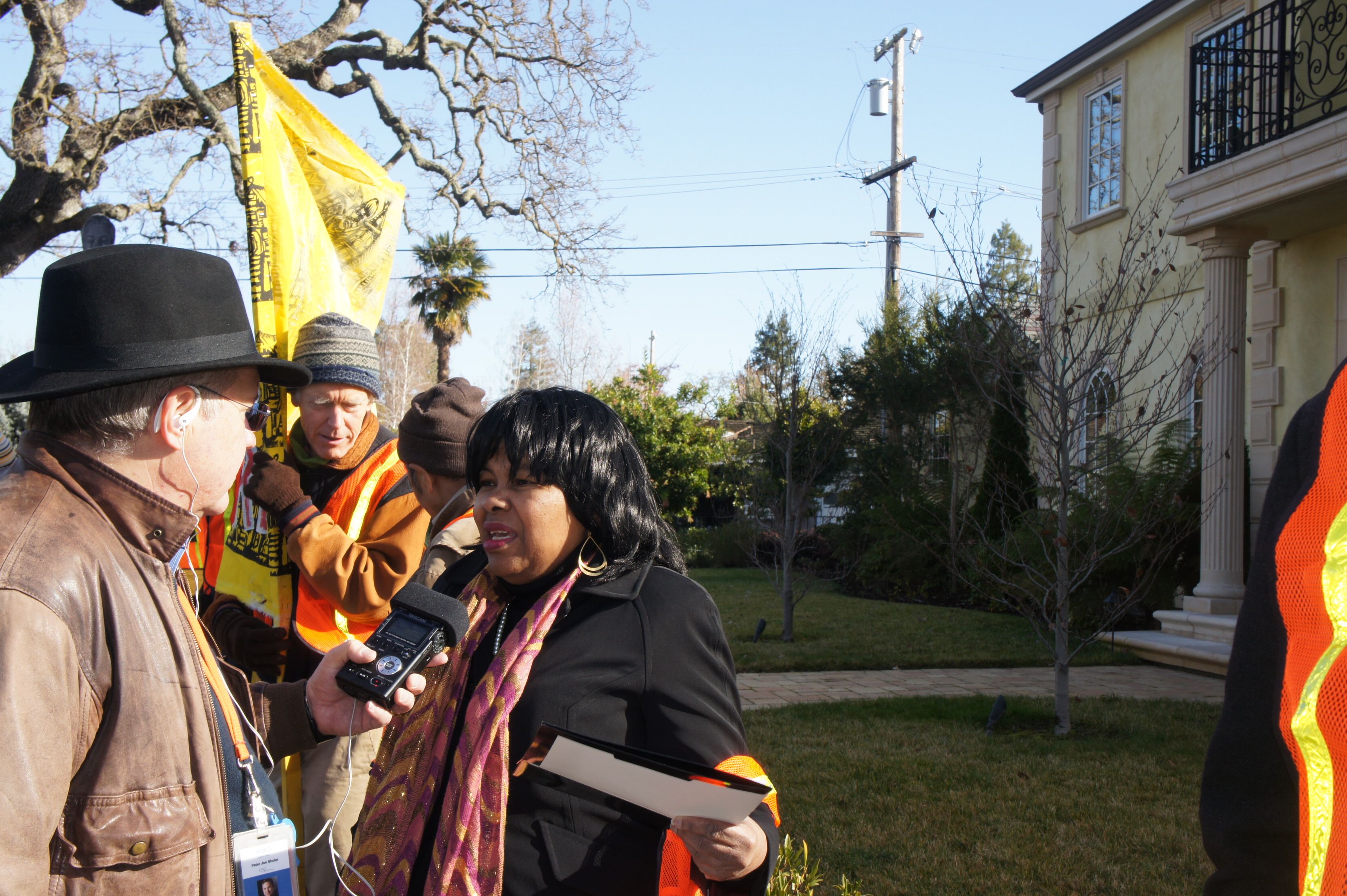 In Menlo Park today, demonstrators protested in front of the Dream House that is being raffled off to benefit the Yerba Buena Center for the Arts in San Francisco. They explained their objection to the Dream House model of fundraising.