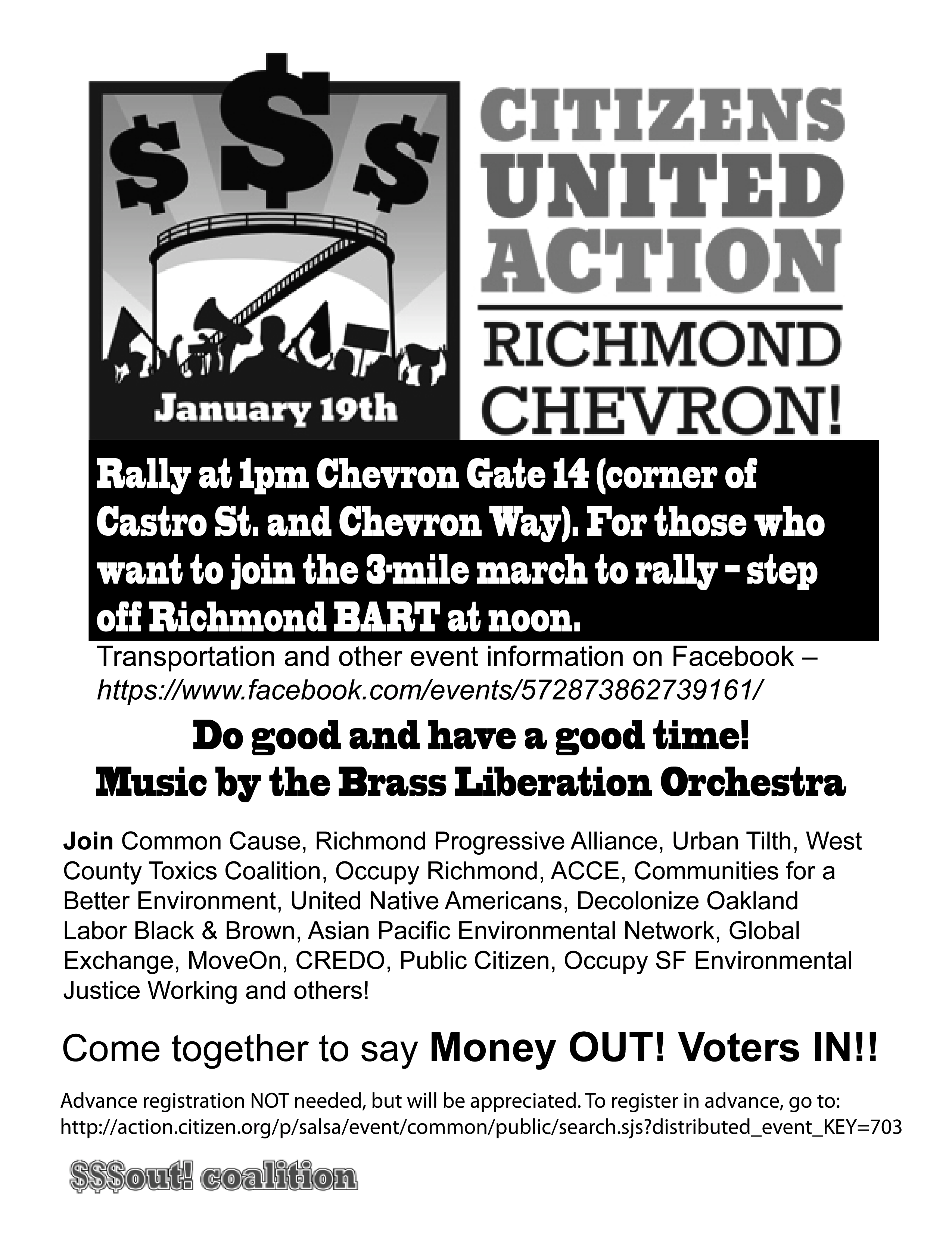 Join Common Cause, Richmond Progressive Alliance, Global Exchange, MoveOn, Urban Tilth, Occupy Richmond, Occupy San Francisco Environmental Justice Working Group, West County Toxics Coalition, Communities for a Better Environment, Amazon Watch, Move to Amend and many others on January 19th at 12 noon at the Richmond BART station for a 2.6 mile march to the Chevron refinery gates for a CORPORATE CLEAN UP ACTION. If you're not up for a hike, just meet at 1 pm at Chevron Gate 14 (Castro St. and Chevron Way).