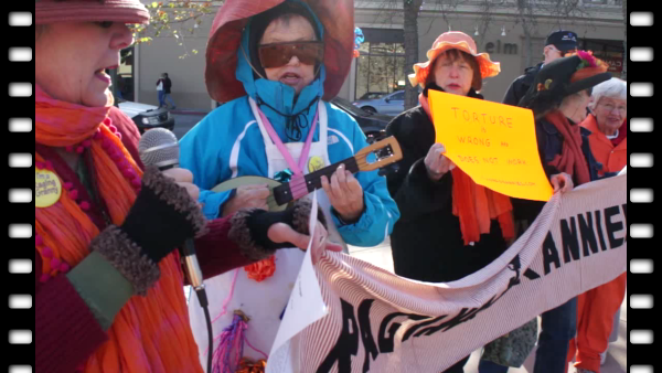 Amnesty International Chapter 19 members are seen in this video setting up in Palo Alto's Lytton Plaza on Sunday January 13th. The Raging Grannies are seen here rehearsing their composition "Stand in Orange" shortly before the protest began in earnest.