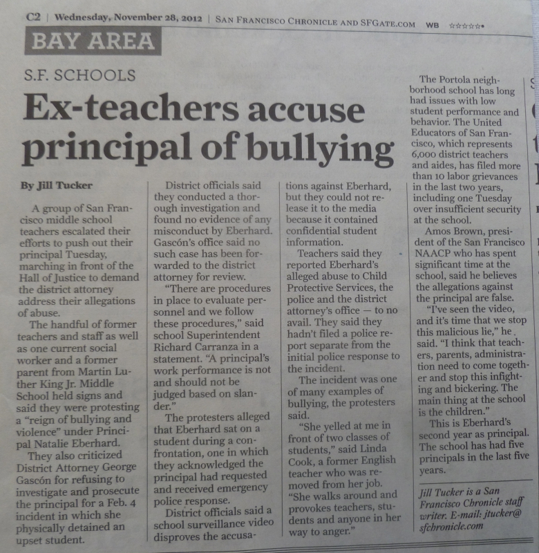 In fact, there was no such full investigation and the actual witnesses to the incident were never interviewed. After a press conference of parents, teachers and staff called by the USEF at the school, the principal with the support of Associate Superintendent Jeannie Pon actually bullied out of the school 17 staff members and recently unsuccessfully tried to fire Tobias for his whistleblowing.