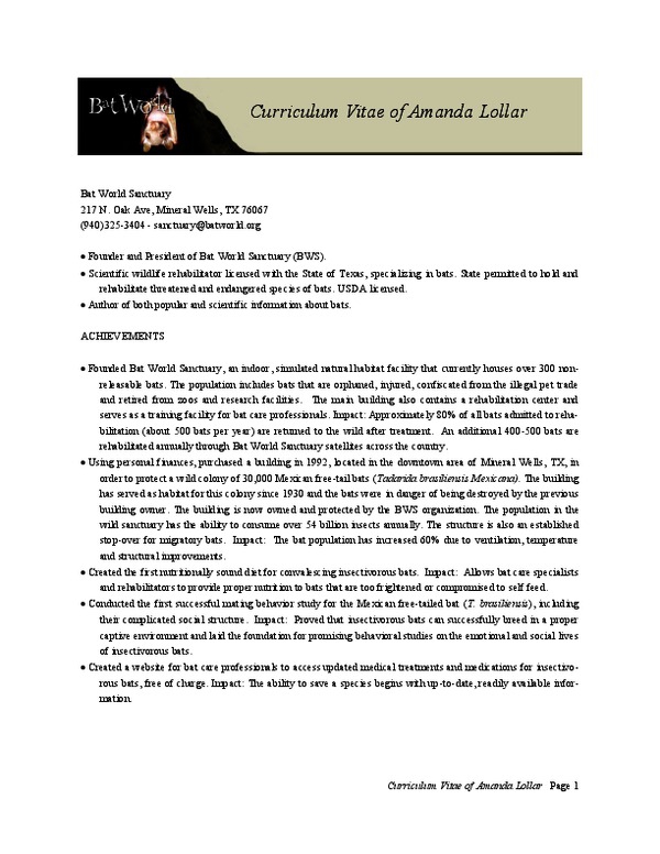 "Founded Bat World Sanctuary, an indoor, simulated natural habitat facility that currently houses over 300 non-releasable bats. The population includes bats that are orphaned, injured, confiscated from the illegal pet trade and retired from zoos and research facilities."