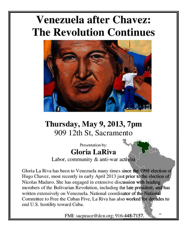 Presentation by Gloria LaRiva, labor, community & anti-war activist. La Riva has been to Venezuela many times since the 1998 election of Hugo Chavez, most recently in early April 2013 just prior to the election of Nicolas Maduro. She has engaged in extensive discussion with leading members of the Bolivarian Revolution, including the late president, and has written extensively on Venezuela. National coordinator of the National Committee to Free the Cuban Five, La Riva has also worked for decades to end U.S. hostility toward Cuba.