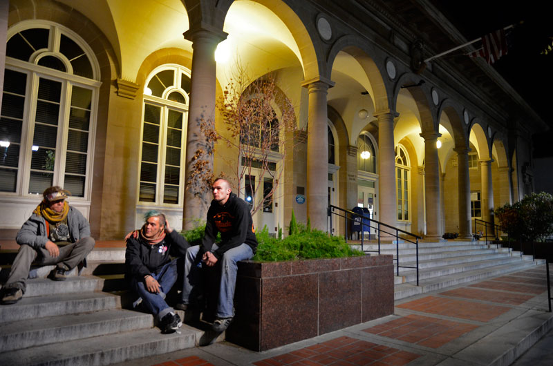 When interviewed on the fourth and final evening of the protest, the young group of travelers who initiated the action didn't recognize some of the other people sleeping there with them at the post office. A small group of individuals that was sleeping to the south end of the post office steps was made up of older individuals who carried their possessions in a shopping cart.