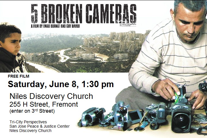 One of the most complicated conflicts in the world is the ongoing conflict is Israel/Palestine. No one documentary can tell the whole story, and "5 Broken Cameras" doesn’t try to. Instead, Emad Burnat tells his story, one of millions of stories from the region. A free screening of this 2013 Oscar nominee for “Best Documentary” on Saturday, June 8, at 1:30, at Niles Discovery Church, 255 H Street, Fremont, is co-sponsored by the church, Tri-City Perspectives and the San Jose Peace and Justice Center. It is being shown with the belief that the more we hear individuals’ stories from this region the more likely it is that we can find solutions to the violence. A discussion will follow the screening.