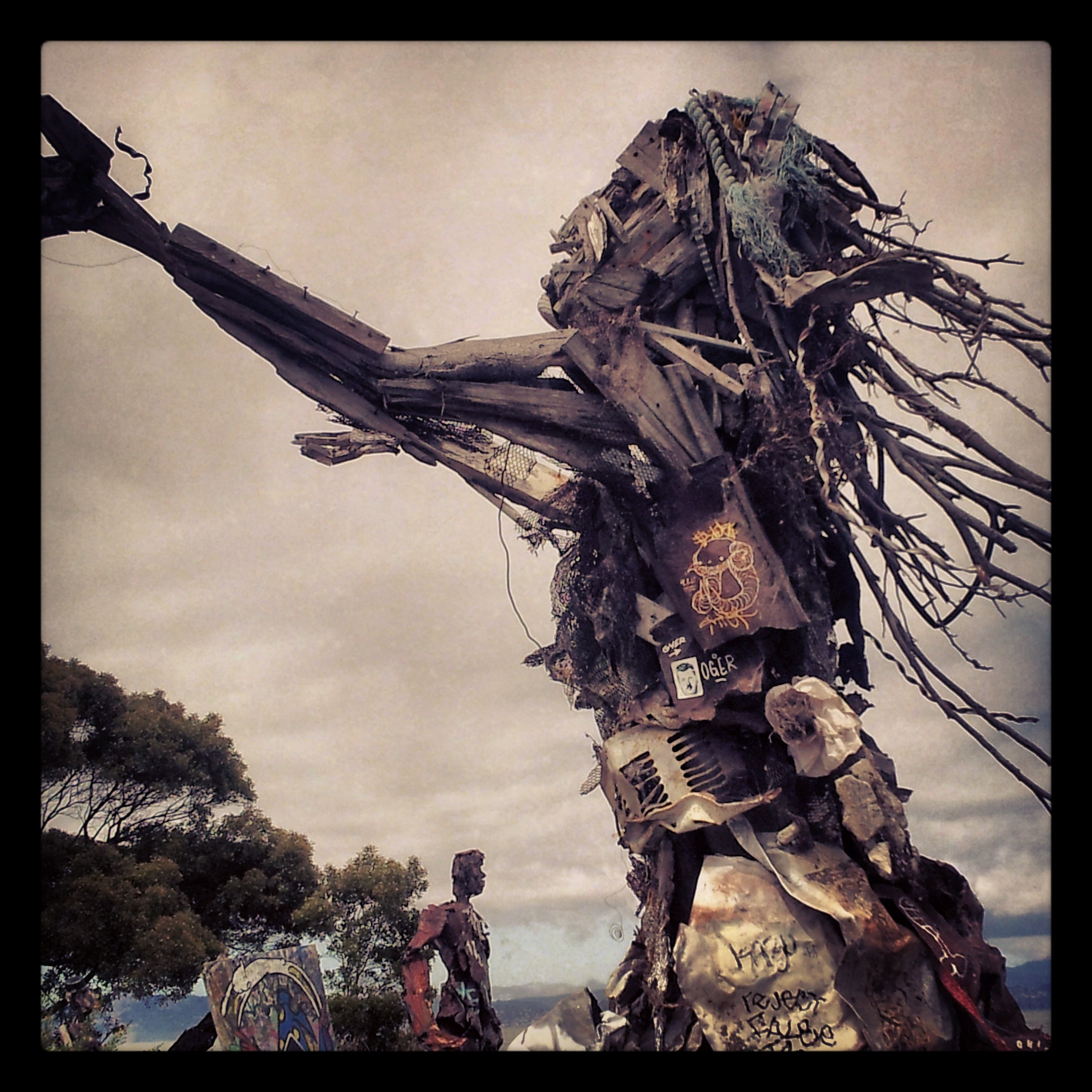 For many though, the most infamous part of the park however, is the art, much of it created by materials found on the landfill itself. Most iconic of all the art are the the statues, most being created in part by Osha Nuemann, a former member of Up Against the Wall Motherfuckers! and later, Black Mask, two early anarchist groups from the late 1960's. Osha, along with friends, has created a series of amazing statues that can be found along the shoreline of the Bulb. "It's art without restraint," says Osha of the art. "Art coming out of nature, without having to look over its shoulder and ask permission." Graffiti artists also are a part of the Bulb's rebel culture, with pieces popping up from anarchist writters such as GATS, and SWAMPY, as well as underground legends such as OLD CROW. One group, based out of Oakland, called "SNIFF," also created a series of art installations around the Bulb, including many paintings.
