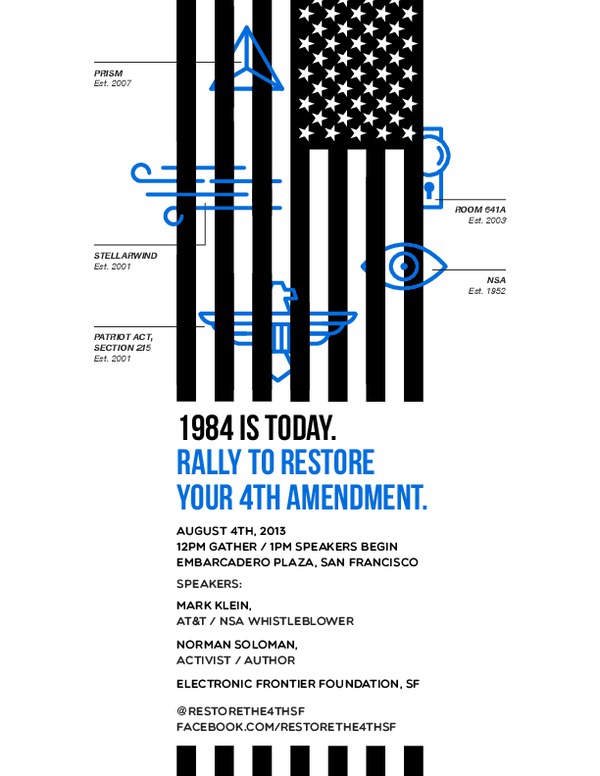 1984 Day is a protest rally and outreach event against the growing surveillance state and in support of the full restoration of our 4th Amendment rights. The day will conclude with a march. Come with signs and costumes that show our displeasure with Big Brother!