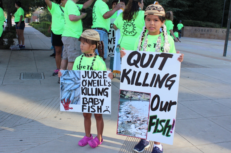 Photo: Hoopa Valley Tribal members at the federal courthouse protesting against Westlands Water District's lawsuit against increased flows on the Trinity River. Photo by Dan Bacher.
