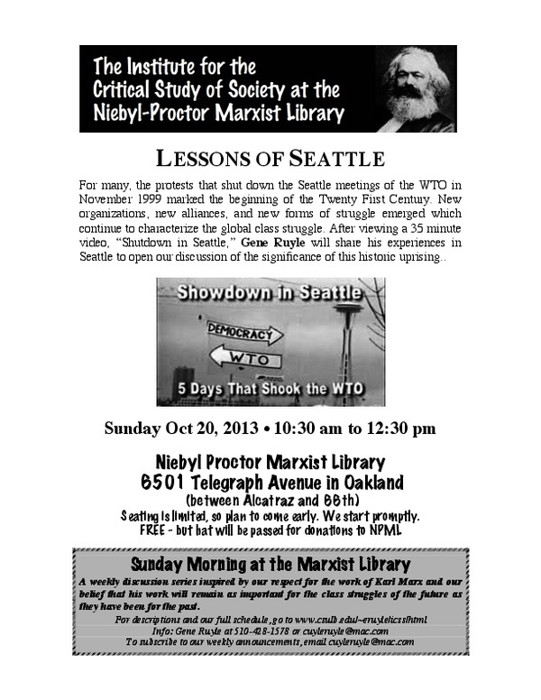 For many, the protests that shut down the Seattle meetings of the WTO in November 1999 marked the beginning of the Twenty First Century. New organizations, new alliances, and new forms of struggle emerged which continue to characterize the global class struggle. After viewing a 35 minute video, “Shutdown in Seattle,” Gene Ruyle will share his experiences in Seattle to open our discussion of the significance of this historic uprising..