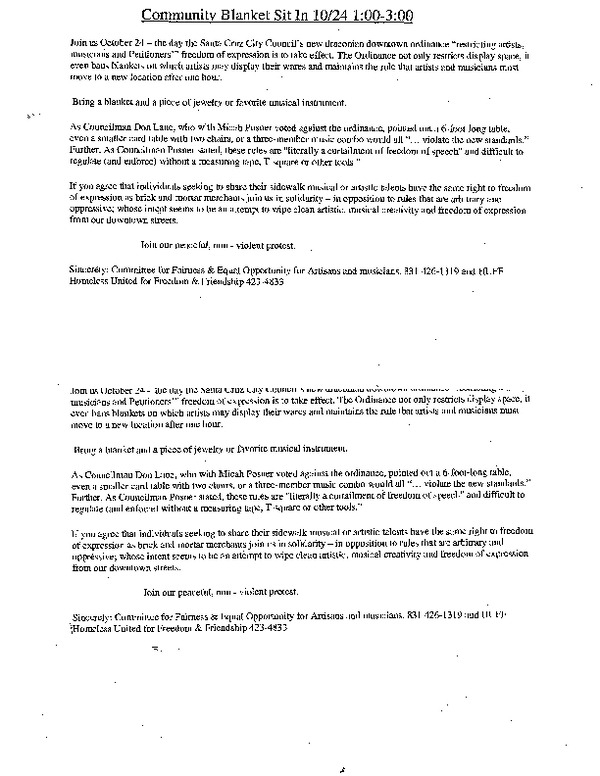 The Committee for Fairness & Equal Opportunity for Artists and Musicians is planning a Community Blanket Sit-In 10-24 1 PM to 3 PM as described below. Bring video equipment.
