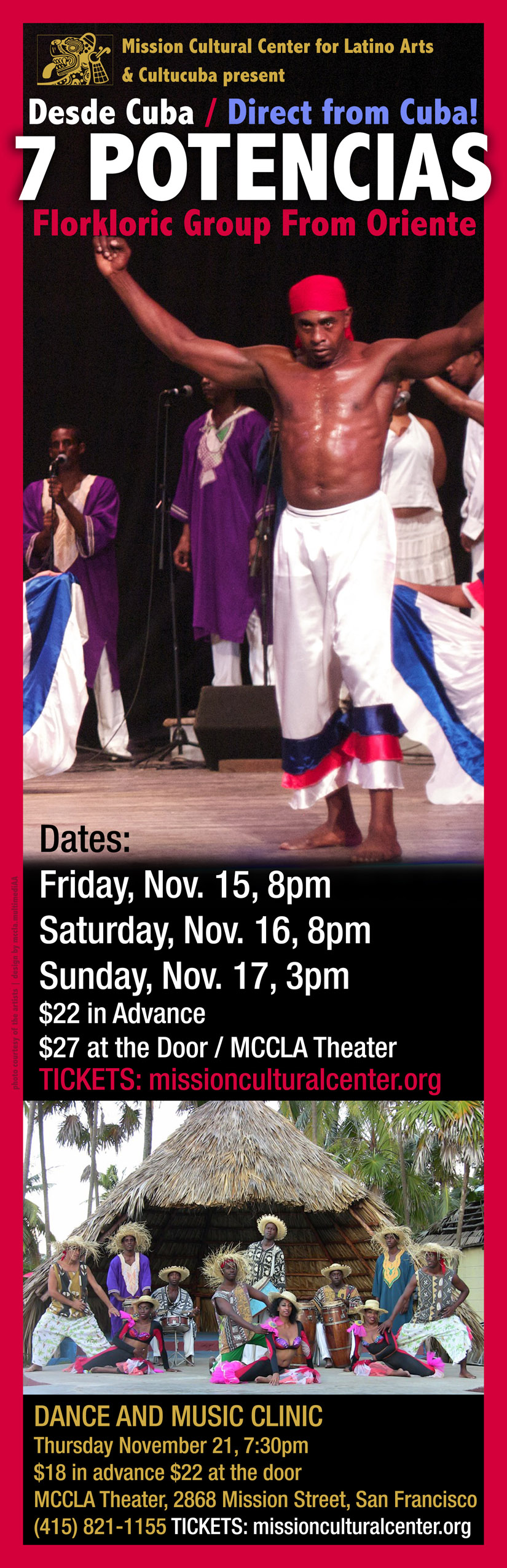 Direct from Cuba 7 Potencias Friday, November 15 & Saturday 16 / 8:00pm / Sunday 17 3:00pm $22 in advance and $27 at the Door / Theater 7 Potencias presents a rich and vibrant culture from the lesser known part of eastern Cuba, known in Cuba as the Oriente.