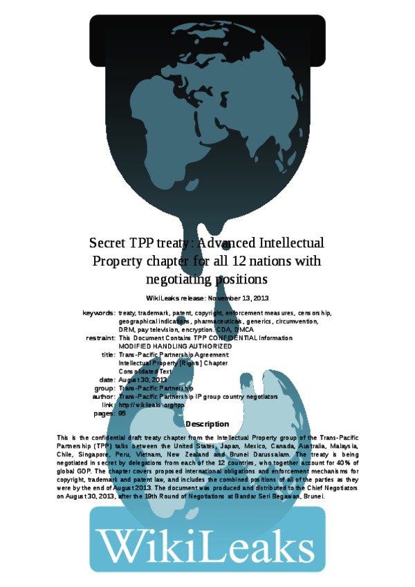 WikiLeaks’ Editor-in-Chief Julian Assange stated: “The US administration is aggressively pushing the TPP through the US legislative process on the sly.” The advanced draft of the Intellectual Property Rights Chapter, published by WikiLeaks on 13 November 2013, provides the public with the fullest opportunity so far to familiarise themselves with the details and implications of the TPP.