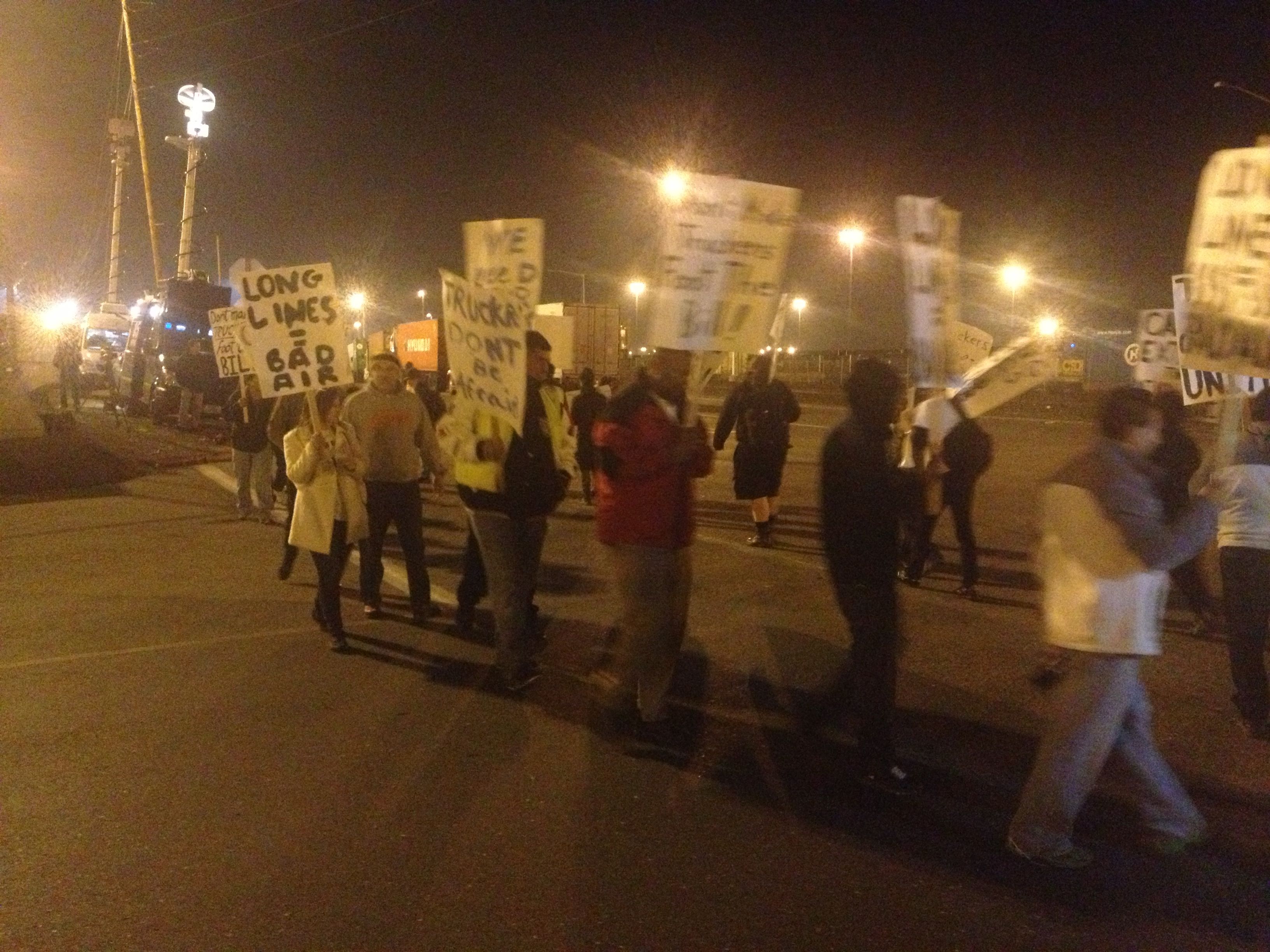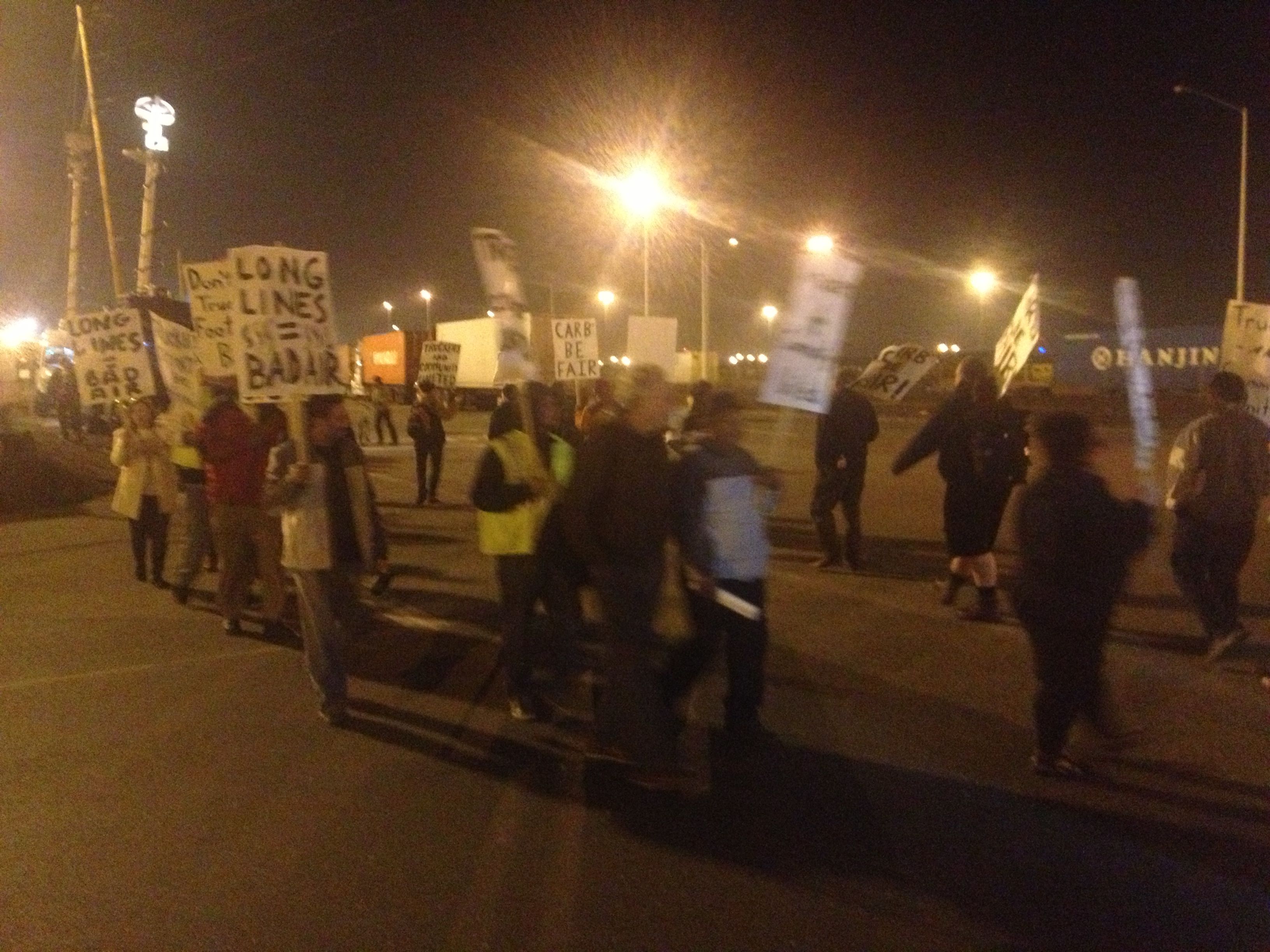 The Oakland Port Truckers have shut down the first entrance to the port at 5a.m. this morning, Wednesday, November 27, 2013. Police have already announced that they will enforce keeping the intersection at K Street and Middle Harbor Road. Oakland Port Truckers will need more folks in solidarity to shut down further entrances to the port and maintain the picket lines against the enforcement of the Oakland Police Department. Rides are available to the port shut down from the West Oakland BART this morning.