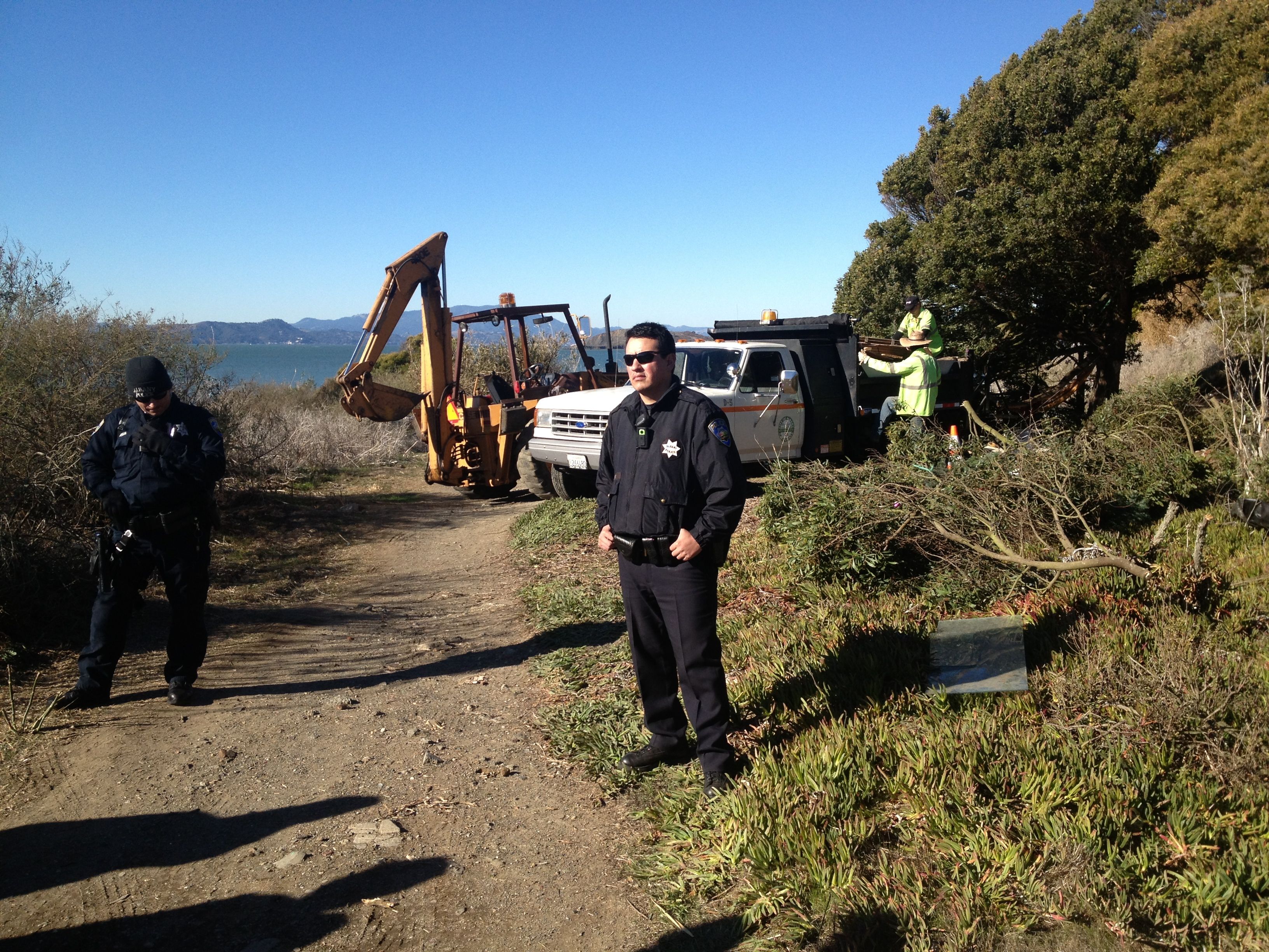 ALBANY -- Workers with the city's Public Works Department, accompanied by Albany police officers, removed what the city called "abandoned" encampments at the Albany Bulb on Dec. 9, drawing reaction from protesters who oppose plans to remove homeless residents there before turning the Bulb over to the East Bay Regional Park District.