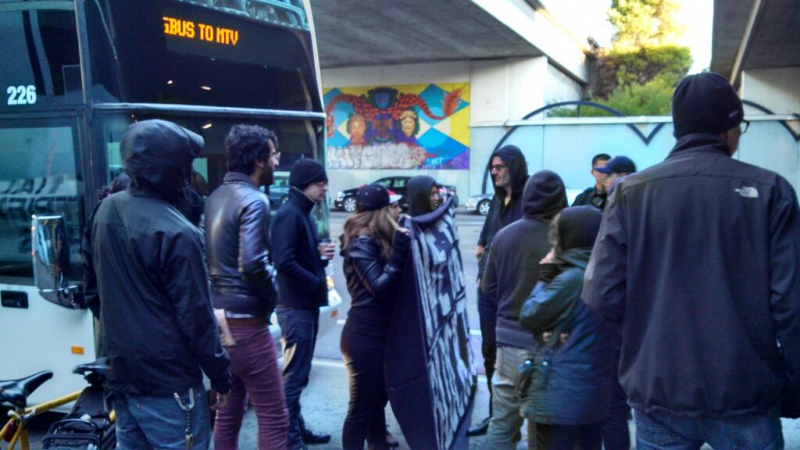 At 7:45am, over 50 protesters swarmed a Google bus picking up highly-paid tech workers at MacArthur BART station in Oakland. They successfully blocked it for over half an hour before OPD arrived and cleared the street, allowing the bus to continue on to the Google HQ in Mountainview as it does every day. An Apple bus was also temporarily blocked during the action and hundreds of flyers were passed out to those on the street who were overwhelmingly supportive. The action was planned to coincide with other Google Bus blockades across the Bay this morning as an escalation in the fight against gentrification and the rapid transformation of our cities into playgrounds for the super rich. Photos and the flyer handed out at the action are below: