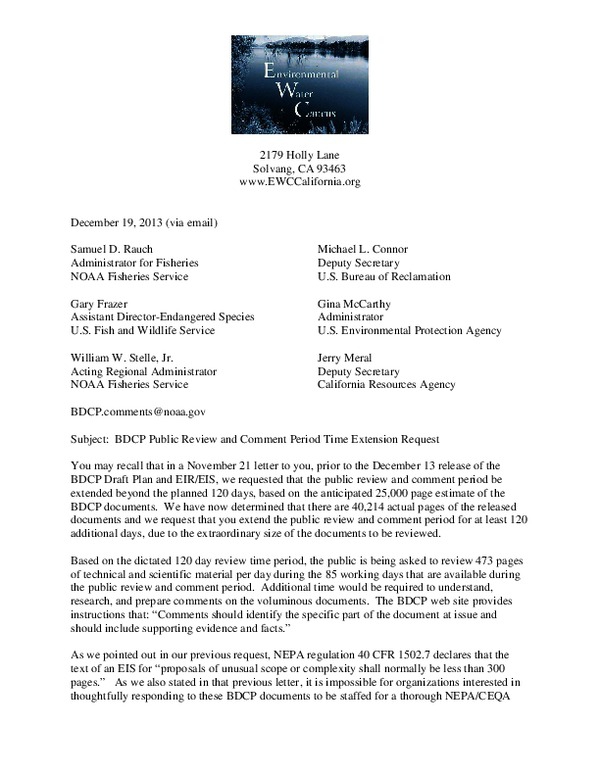 "You may recall that in a November 21 letter to you, prior to the December 13 release of the BDCP Draft Plan and EIR/EIS, we requested that the public review and comment period be extended beyond the planned 120 days, based on the anticipated 25,000 page estimate of the BDCP documents," wrote Nick Di Croce, Co-Facilitator of the Environmental Water Caucus.