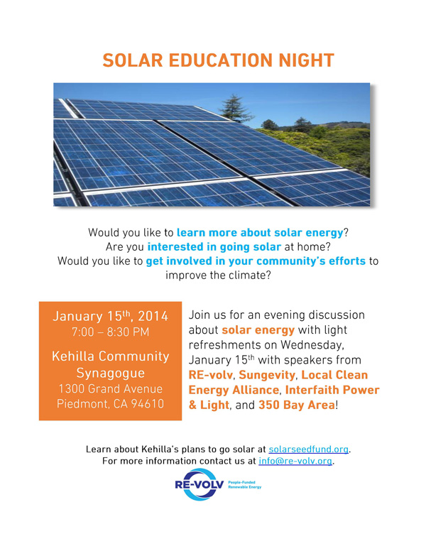 Join us for an evening discussion with light refreshments on Wednesday, January 15th with speakers from RE-volv, Sungevity, Local Clean Energy Alliance, Interfaith Power & Light, and 350 SF Bay Area!